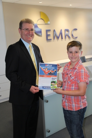 EMRC CEO, Mr Peter Schneider, presented a $100 iFly voucher to an excited Lucas Deshon, aged 10, this month as part of the Swan River Ramble.