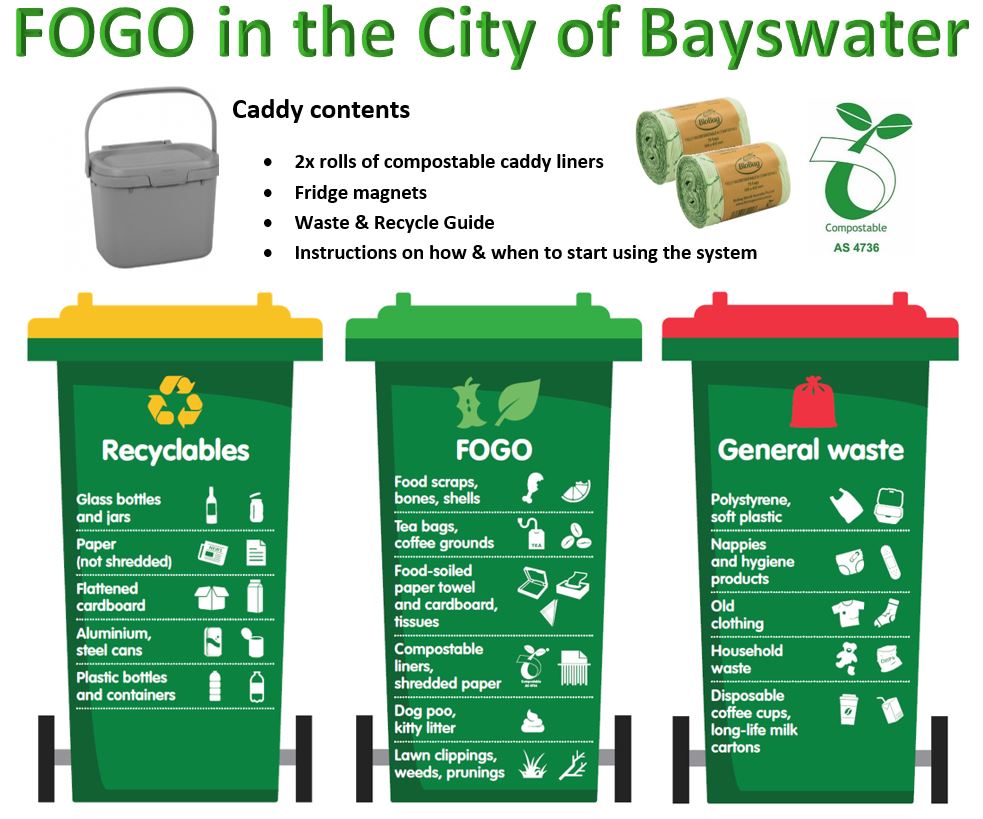 The Eastern Metropolitan Regional Council (EMRC) congratulates the City of Bayswater for its successful launch of a new household three-bin waste sorting system for collection of Food Organics and Garden Organics (FOGO) material.